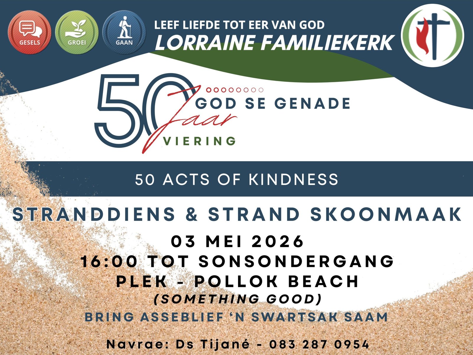 Ons aanbid God Drie-enig. Die sirkel verteenwoordig God die Vader se teenwoordigheid. Die kruis herinner ons aan Jesus se verlossing. Die vlam is die Heilige Gees. Daarmee saam staan die Bybel sentraal in ons prediking en word daarom as deel van die kruis uitgebeeld.